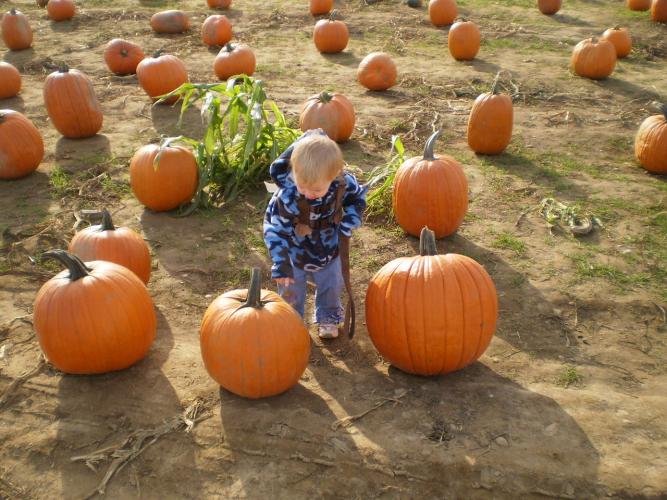 Here is your little grandbaby picking her first pumpkin. She wanted all of them. Hehehehehe!!!